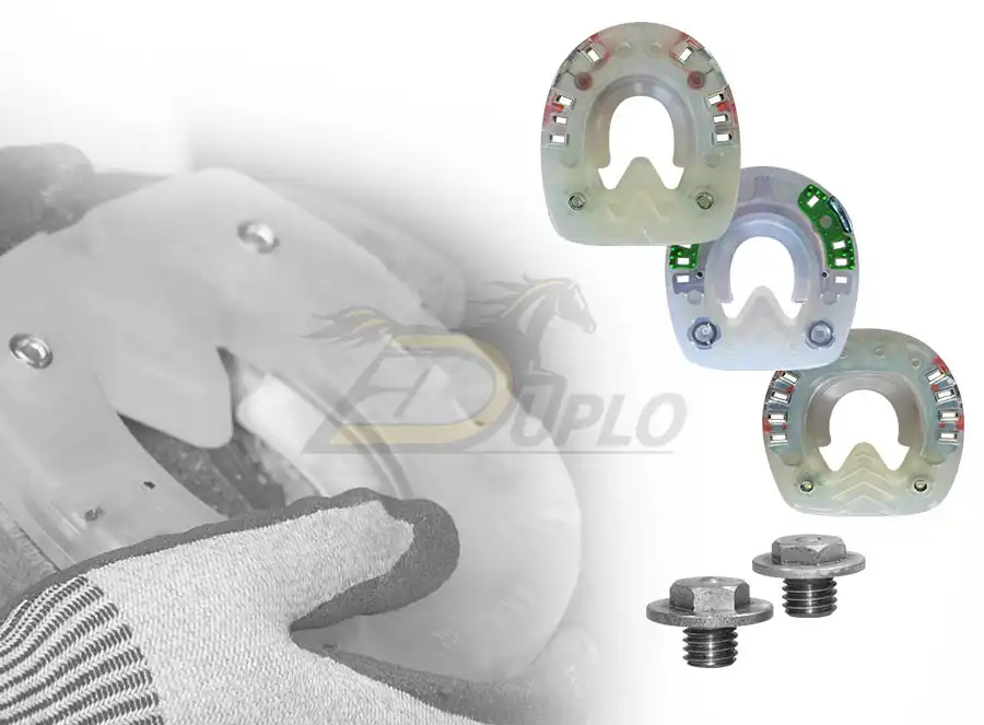 | Ihr Nutzen | Dieses Verbundhufeisen verfügt über Seitenkappen sowie M8-Gewinde, die Sie mit Gleitschutzstollen für optimierten Grip ausstatten können. Wir empfehlen die Nutzung der Extra-Variante (grüner Noppeneinleger ) im Sommer sowie der Standard-Variante (oranger Noppeneinleger) im Winter beziehungsweise ganzjährig bei moderaten Temperaturen. |
