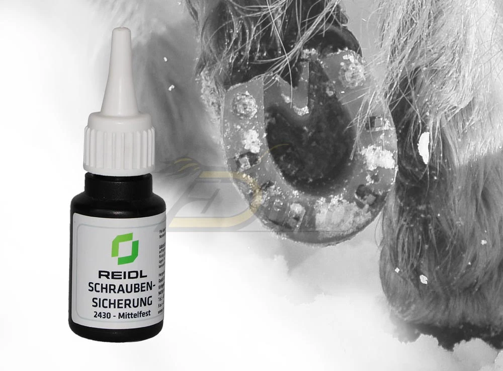 Der mittelfeste anaerober Klebstoff – unter dem Private Label REIDL ausgeliefert – bietet schnelle Handfestigkeit, hohe Temperaturbeständigkeit und eignet sich unserer Meinung nach ideal für dauerhafte Fixierung der Stollen im Hufeisen.